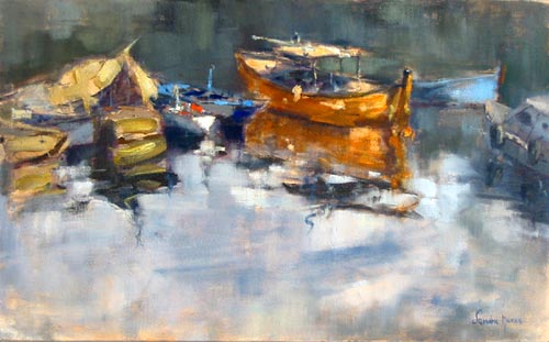 Esses barcos flutuam nas águas de uma marina informal (Quadrado da Urca), esperando que os pescadores os levem para mais um dia de trabalho.
